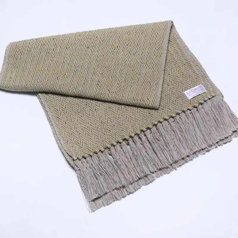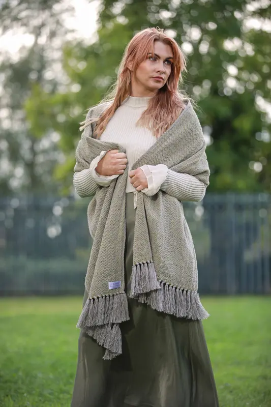 The Drumlin Herringbone Wrap, GreyLime, is a celebration of the Monaghan landscape—where gentle, rounded hills rise and fall in quiet rhythm.