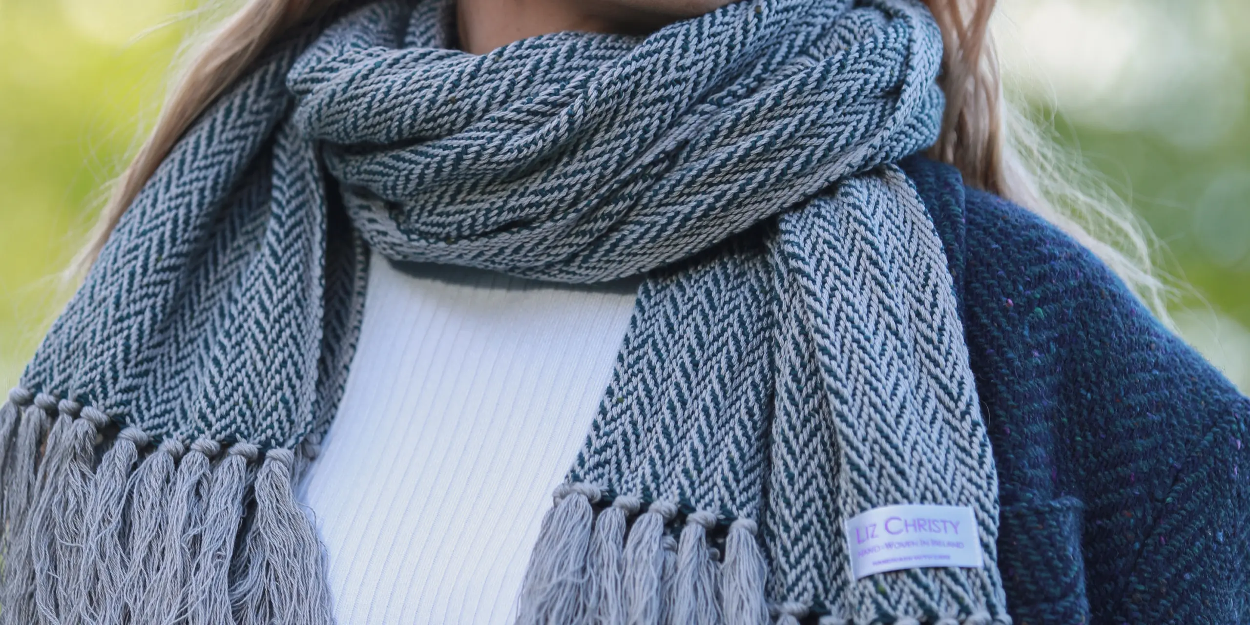 Each wrap is handwoven from soft grey cotton and fine Donegal merino wool. These natural fibres contrast subtly in tone and texture, creating warmth and comfort in every thread. The herringbone weave forms delicate, undulating ridges that echo the familiar drumlin hills. As light moves across the fabric, it highlights the weave’s depth and graceful texture.