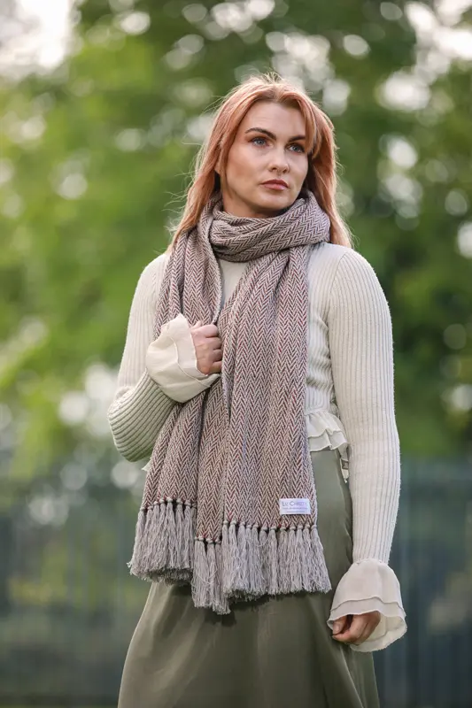 The Drumlin Herringbone Wrap, GreyTan is a celebration of the Monaghan landscape, where gentle, rounded hills rise and fall in quiet rhythm.