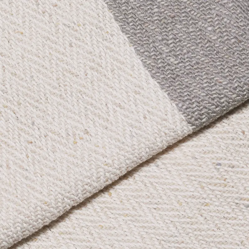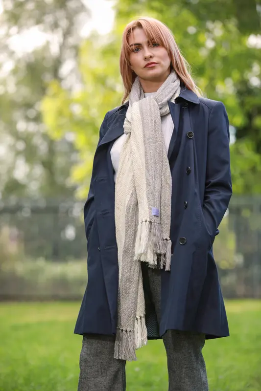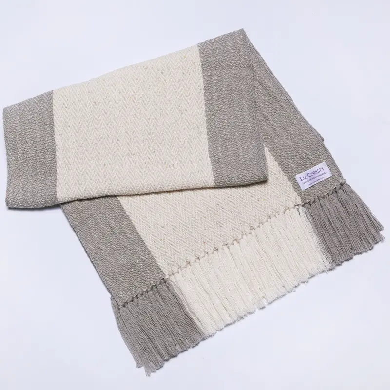 Each wrap is handwoven from soft grey cotton and fine Donegal merino wool. These natural fibres contrast subtly in tone and texture, creating warmth and comfort in every thread. The herringbone weave forms delicate, undulating ridges that echo the familiar drumlin hills. As light moves across the fabric, it highlights the weave’s depth and graceful texture.
