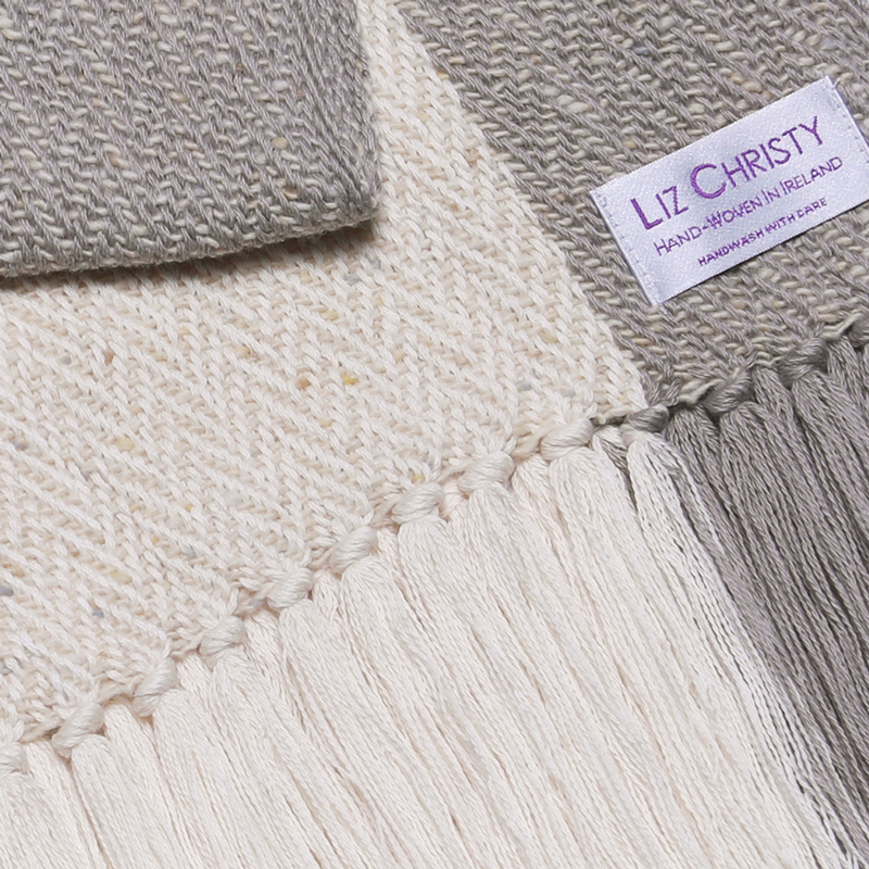 The Drumlin Wrap, TwoTone GreyEcru, is a celebration of the Monaghan landscape—where gentle, rounded hills rise and fall in quiet rhythm. Each piece is handwoven in soft grey cotton and Donegal merino wool, chosen for their subtle contrast and comforting warmth.