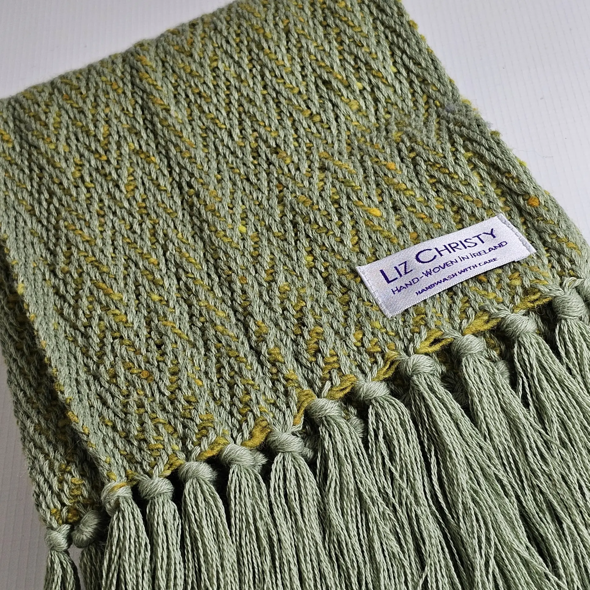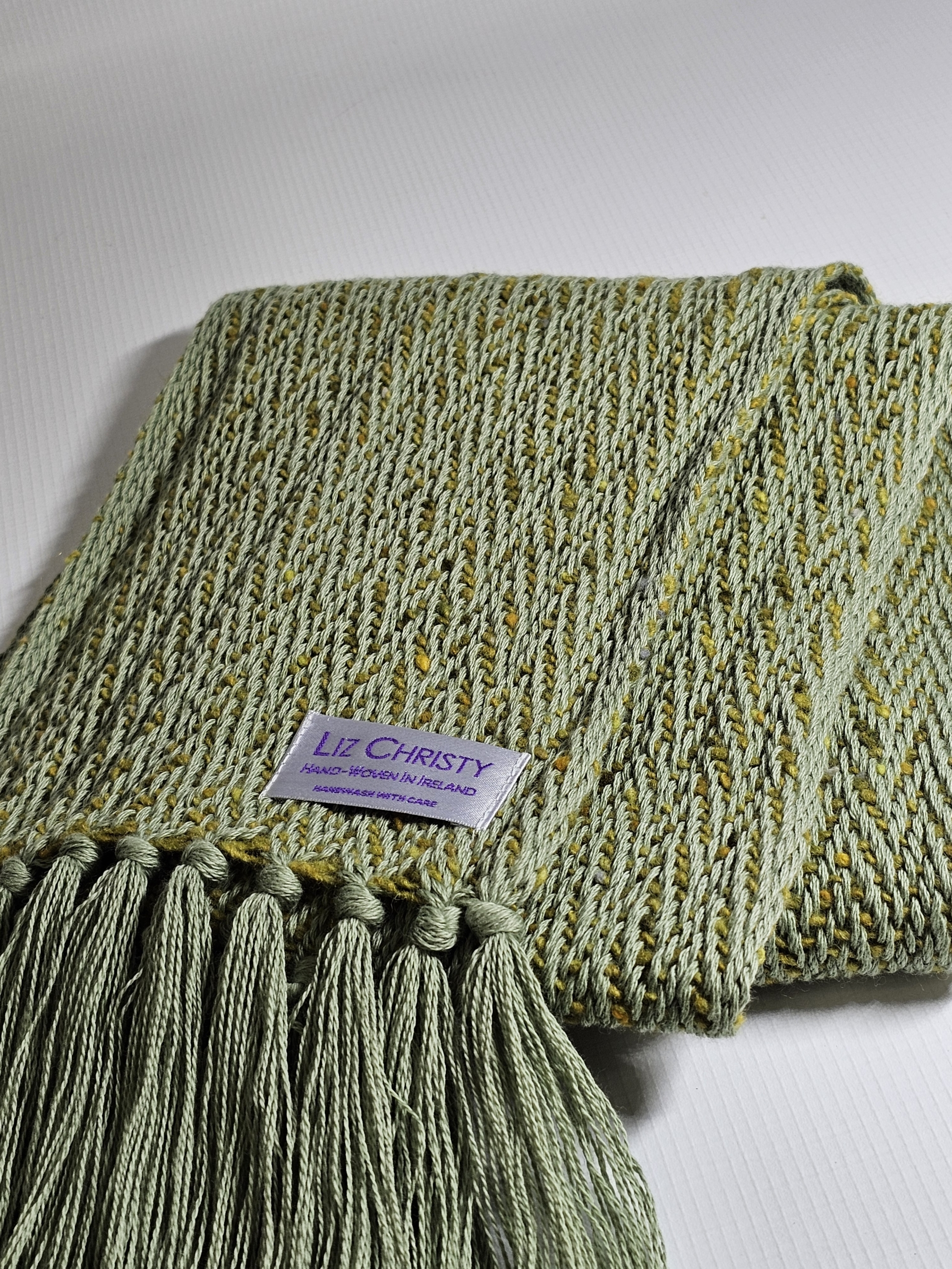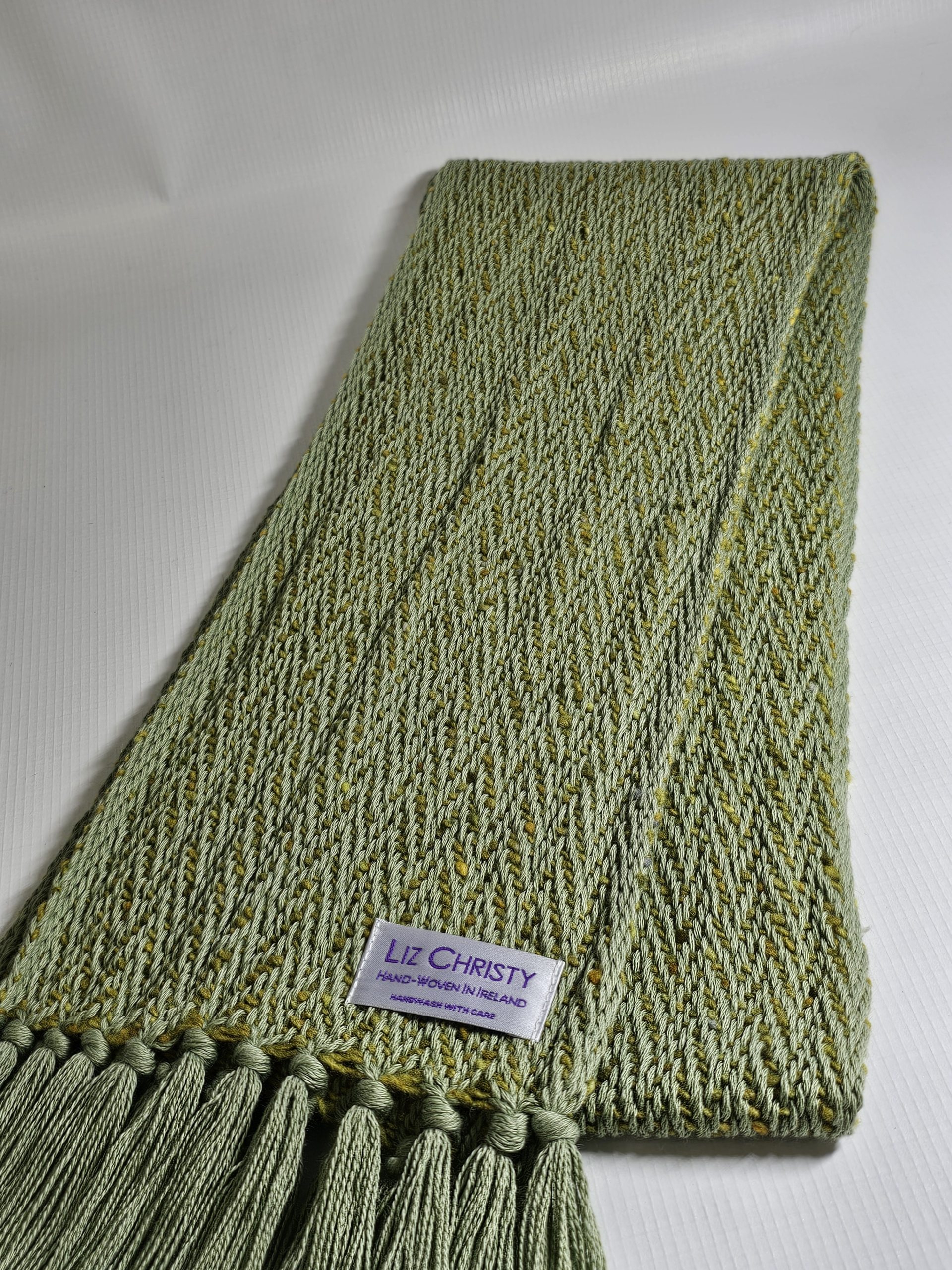 The Drumlin Scarf, GreenLime is a celebration of the Monaghan landscape, where gentle, rounded hills rise and fall in quiet rhythm. Each piece is handwoven in soft grey cotton and Donegal merino wool, chosen for their subtle contrast and comforting warmth.