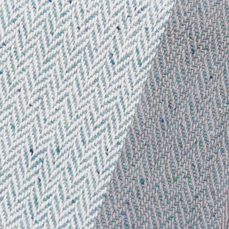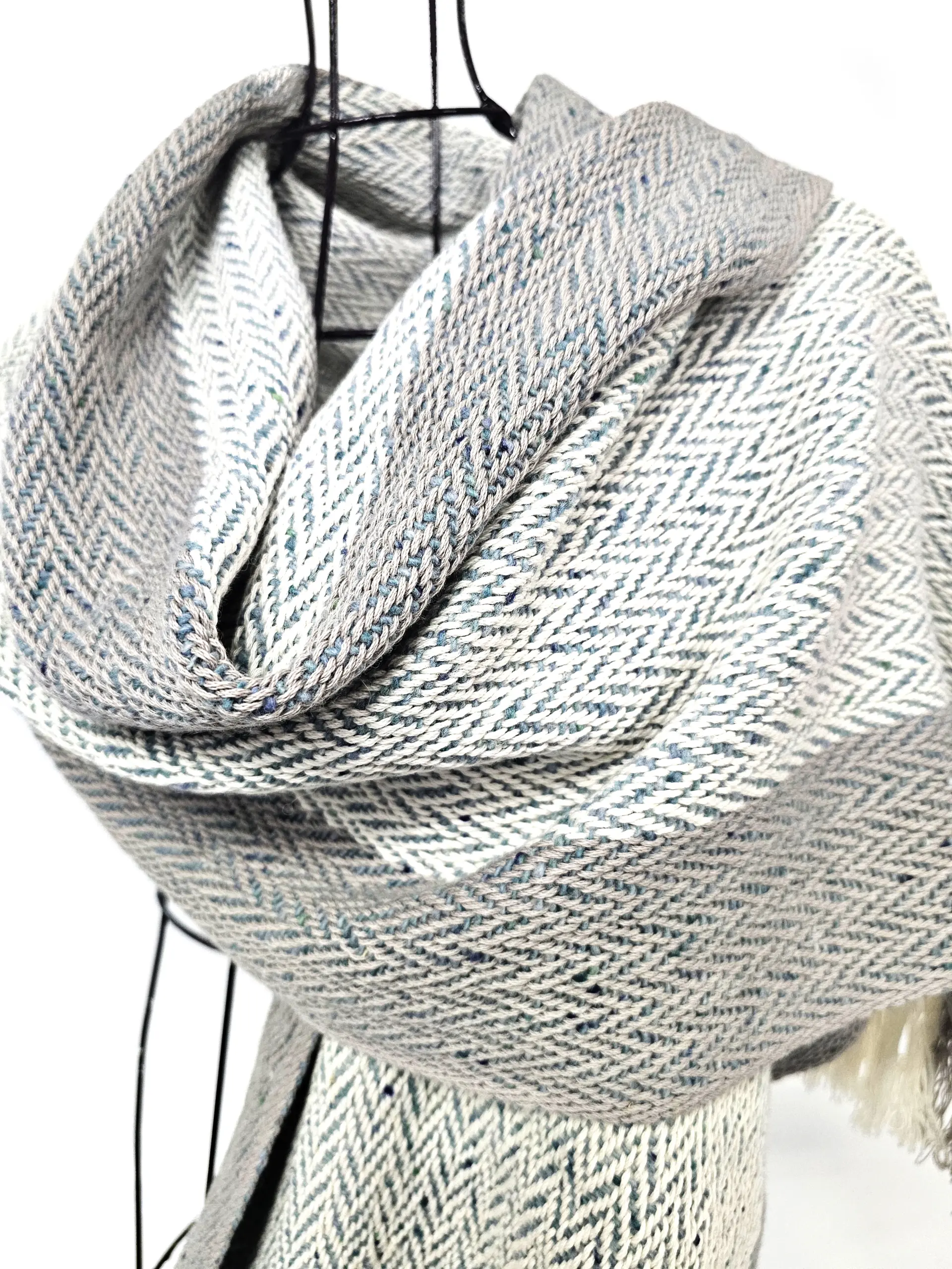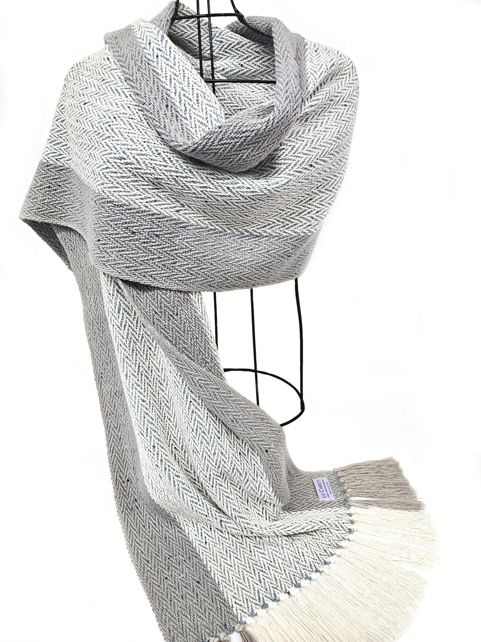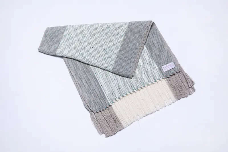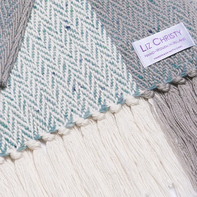Each wrap is handwoven from soft grey cotton and fine Donegal merino wool. These natural fibres contrast subtly in tone and texture, creating warmth and comfort in every thread. The herringbone weave forms delicate, undulating ridges that echo the familiar drumlin hills. As light moves across the fabric, it highlights the weave’s depth and graceful texture.