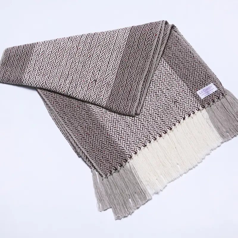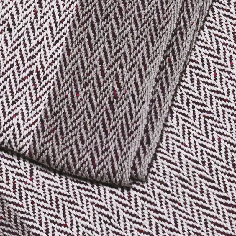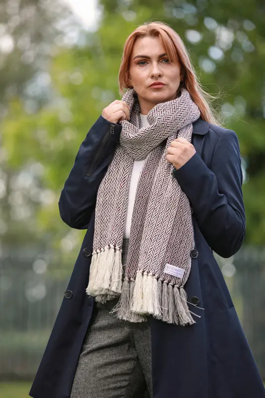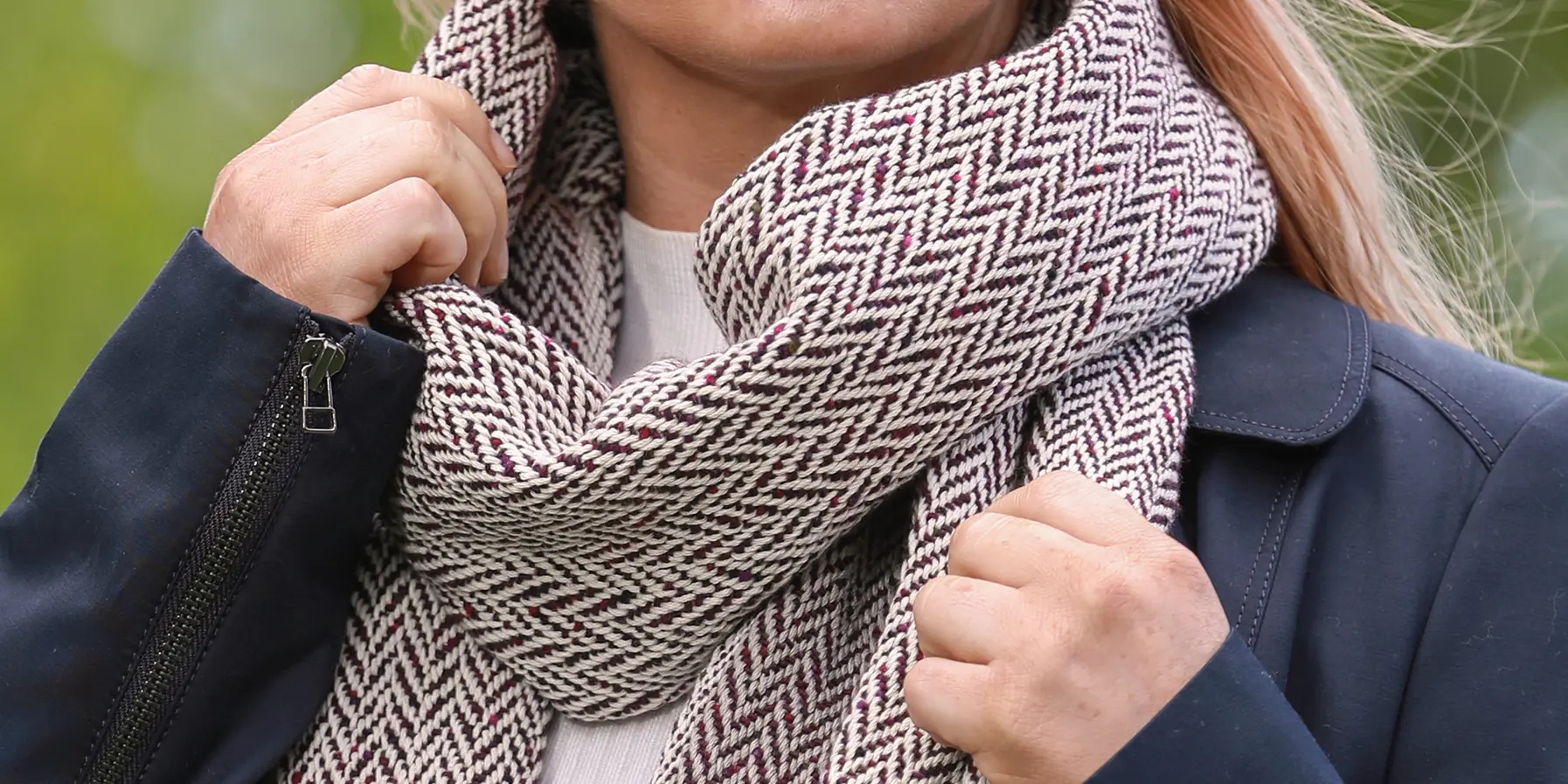 Each wrap is handwoven from soft grey cotton and fine Donegal merino wool. These natural fibres contrast subtly in tone and texture, creating warmth and comfort in every thread. The herringbone weave forms delicate, undulating ridges that echo the familiar drumlin hills. As light moves across the fabric, it highlights the weave’s depth and graceful texture.