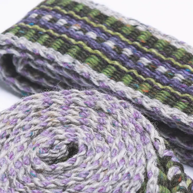 Woven at Swallow Studios in a palette of grey, mauve and green, the tones of this belt echo the watery depths of the River Fane. This design is edged in soft grey. It symbolises the river, a fluid and natural boundary in a landscape shaped by history and resilience.