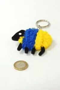 This LizzyC-Sheep Keyring County Clare is handwoven in Ireland. It features the yellow and blue of